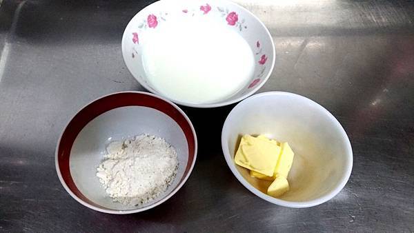 我們先做白醬,材料有: 無鹽奶油20克、麵粉20克(奶油與麵粉比例為1:1)、牛奶160~200克