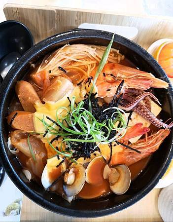 部隊鍋上面撒了海苔絲跟蔥絲(蔥絲蠻好看的)、料蠻多的,豆腐、蝦子、章魚、小香腸、泡菜、金針菇、火鍋料、蛤蜊、起司、細拉麵