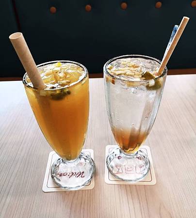 飲料: 新鮮水果茶(左)、琥珀蜜桃氣泡飲(右)