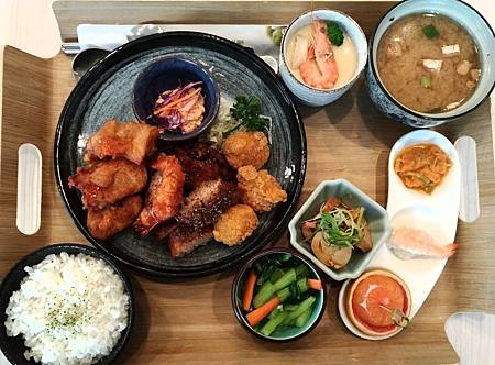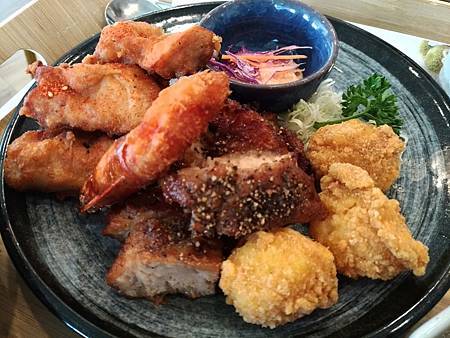 四拼有三顆干貝、五塊唐揚雞、九塊豬排、一隻蝦子,份量很夠