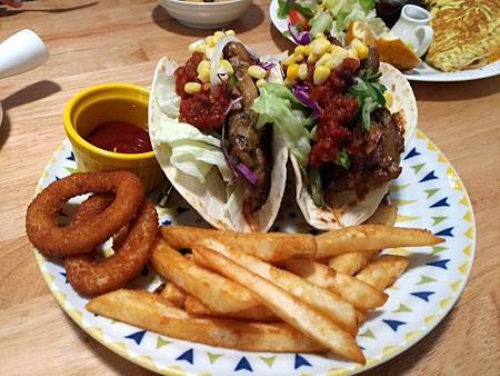 【嫩煎雞腿佐莎莎醬墨西哥捲餅(附洋蔥圈、薯條、飲品)200元】
