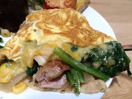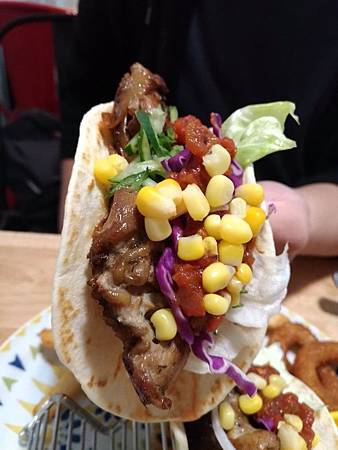內餡有起司、洋蔥、雞肉、玉米、青菜,它真的是好大一個呢!吃完這個可以飽很久