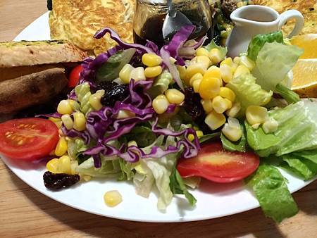 份量也是很多,玉米、生菜、紫高麗、番茄、柳丁,搭配的是胡麻醬