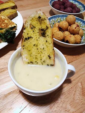 ∎香蒜麵包香蒜味很夠,拿來沾玉米濃湯也很好吃喔!