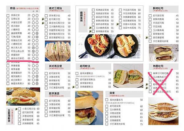 11:00前有供應【五穀潛艇堡、義式三明治、英式瑪芬堡、胚芽漢堡、鐵鍋蛋捲、起司軟法貝果及酥烤吐司】